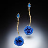 These one-of-a-kind earrings are a new addition to our Larsen Luxe collection and feature teardrop sapphires set in 22kt gold, 18kt gold twigs with diamonds set into them, azurite stones in 18kt gold basket settings, and 18k gold posts. The serene blue of the sapphires is a contrast to the brilliant blue of the azurites.Â