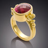 This raspberry tourmaline ring, inspired by Odin himself, embodies wisdom, courage, and natural beauty — a modern heirloom infused with ancient strength. Featuring checkerboard-cut pink tourmaline set in 22kt on a solid 18kt gold triple band with handcrafted buds from a tree branch, this ring is designed to stand out. Handmade in New York City.