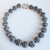 This unique necklace is made of water buffalo horn from the Philippines, where artisans carve the horns after the rest of the buffalo has been used for meat and leather. They then paint the lines and let them sit in the sun. The result is a vibrant necklace that is lightweight and gets a bit darker as your skin oils come in contact with it. Here the horn is combined with different shades of Mexican Fire Opal and a sterling silver clasp for a smart necklace that is perfect with a white t-shirt for a cookout on the beach or for a chic cocktail party. Anywhere you go it will be a conversation starter!