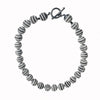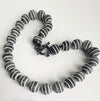 This cool necklace is made of water buffalo horn from the Philippines, where artisans carve the horns after the rest of the buffalo has been used for meat and leather. They then paint the lines and let them sit in the sun. The result is a vibrant necklace that is lightweight and gets a bit darker as your skin oils come in contact with it. Here, the horn is combined with moonstone and onyx beads, and a hand-formed, sterling silver toggle clasp with moonstones on either side of the bar. A unique necklace that is perfect with a white t-shirt for a beach barbecue or for a chic cocktail party.